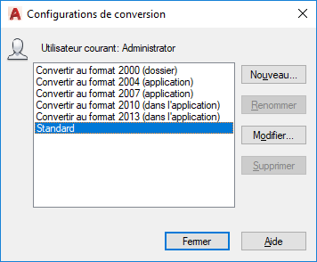 Affiche la boîte de dialogue Modifier la configuration de la conversion, qui vous permet de spécifier des options pour la conversion des dessins sélectionnés.