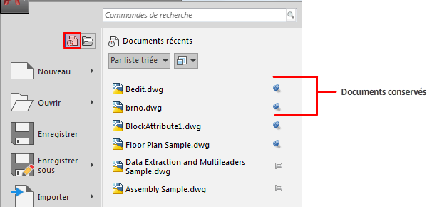 Vous pouvez faire en sorte qu'un fichier reste répertorié, indépendamment des fichiers que vous enregistrez ultérieurement, en cliquant sur le bouton représentant une punaise à droite du nom de fichier. Le fichier est affiché au bas de la liste jusqu'à ce que vous désactiviez ce bouton.