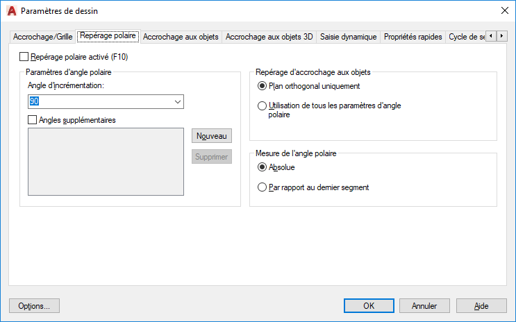 Limite le déplacement du curseur à des angles polaires spécifiés (variable système AUTOSNAP).