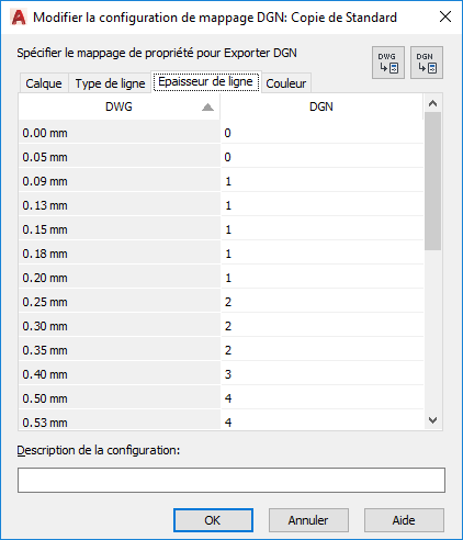 Un jeu prédéfini d'épaisseurs de ligne est affiché. Celui-ci indique la meilleure correspondance entre les épaisseurs de ligne utilisées dans les fichiers DGN et DWG. Vous pouvez copier et coller une ou plusieurs épaisseurs de ligne à l'aide du menu contextuel (clic droit) de la colonne de droite. Vous ne pouvez modifier que la colonne de droite de l'onglet Epaisseur de ligne. La colonne de gauche n'est pas modifiable.