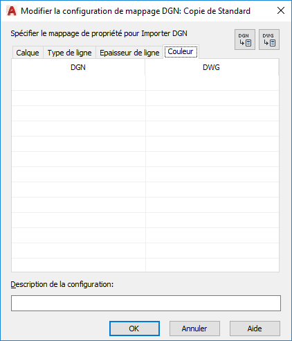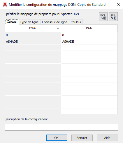 Configuration de mappage existante : si vous êtes en train de modifier une configuration de mappage (même si vous modifiez une configuration autre que Standard à partir de la boîte de dialogue Importer (ou Exporter) les paramètres DGN), les propriétés affichées dans la table de mappage ne sont pas dérivées du fichier DGN importé ou du fichier dessin exporté.