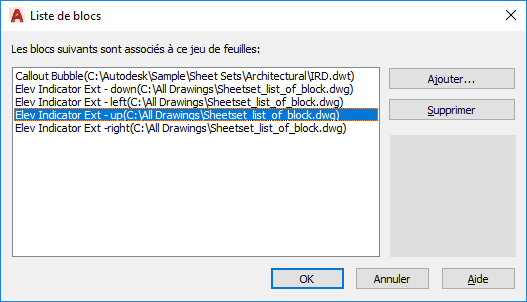 Vous pouvez afficher cette boîte de dialogue en cliquant sur le bouton Ajouter des blocs de la boîte de dialogue Catégorie de vue ou en cliquant sur le bouton [...] en regard de Blocs repères de vue dans la boîte de dialogue Propriétés du jeu de feuilles.