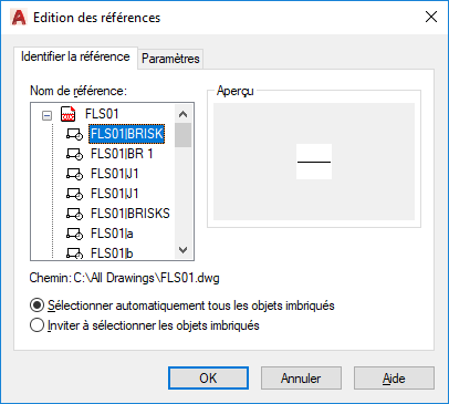 Pour sélectionner une référence à modifier, sélectionnez un objet dans la référence. Si vous sélectionnez un objet qui fait partie d'une ou de plusieurs références imbriquées, celles-ci sont affichées dans la boîte de dialogue.