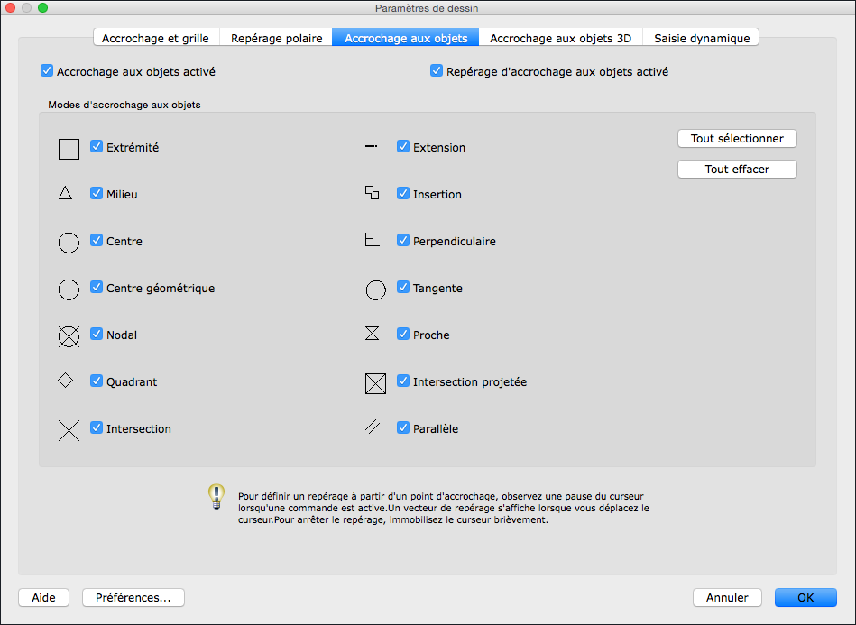 Dresse la liste des accrochages aux objets que vous pouvez activer sous forme d'accrochages aux objets actifs.
