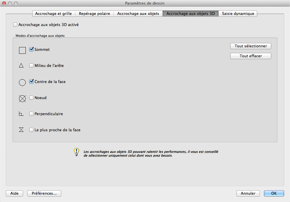 Active et désactive les accrochages aux objets 3D. L'accrochage aux objets 3D sélectionné sous Modes d'accrochage aux objets 3D fonctionne tant que l'accrochage aux objets est actif (Variable système 3DOSMODE)