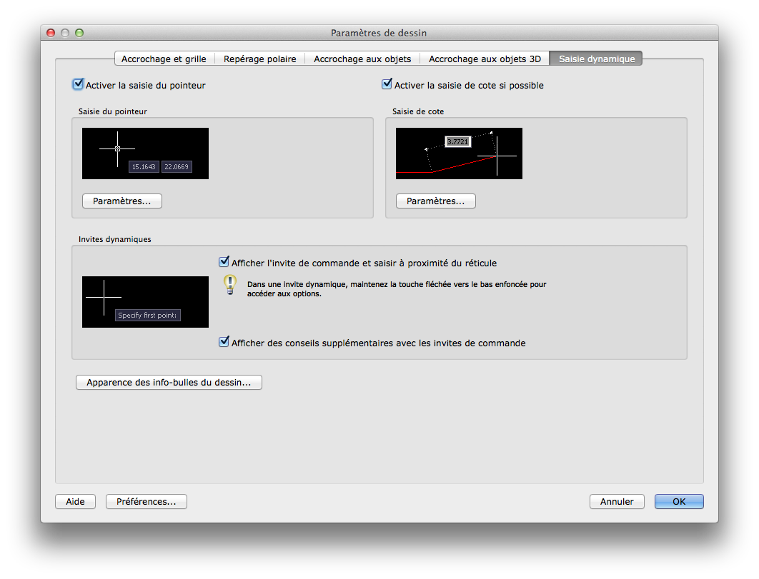 Gère la saisie du pointeur, la saisie de cote, les invites dynamiques et l'apparence des info-bulles de dessin.