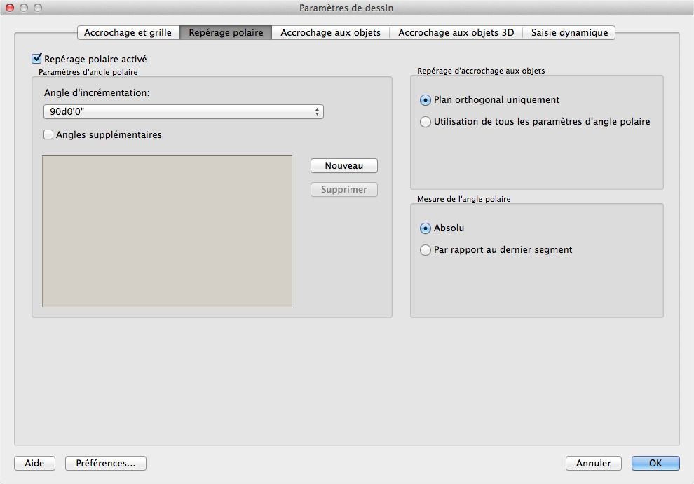 Si l'option Angles supplémentaires est sélectionnée, énumère les angles supplémentaires qui sont disponibles. Pour ajouter de nouveaux angles, cliquez sur Nouveau. Pour supprimer des angles existants, cliquez sur Supprimer (variable système POLARADDANG).