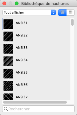 La bibliothèque de hachures peut être affichée sous forme de boîte de dialogue lors de l'utilisation de la boîte de dialogue Hachures et gradient, ou en tant que palette à partir du viseur Hachures ou Gradient.