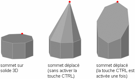 Vous pouvez modifier la forme d'une surface ou d'un solide 3D en modifiant un ou plusieurs sommets. Utilisez les poignées et les gizmos, ou exécutez les commandes DEPLACER, ROTATION ou ECHELLE. Lorsque vous mettez des sommets à l'échelle ou que vous les faites pivoter, vous devez sélectionner au moins deux sommets pour voir un changement dans l'objet. Si vous cliquez et faites glisser un sommet, vous étirez l'objet 3D.