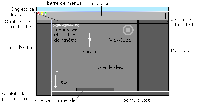 Par défaut, l'interface utilisateur affiche les palettes et les barres autour de la zone de dessin. En outre, plusieurs contrôles s'affichent dans la zone de dessin.