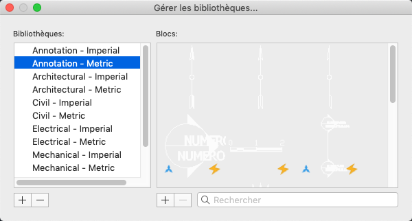 Répertorie les bibliothèques disponibles. Sélectionnez dans la liste des blocs une bibliothèque pour gérer les blocs qu'elle contient. Cliquez deux fois sur le nom d'une bibliothèque pour la renommer.