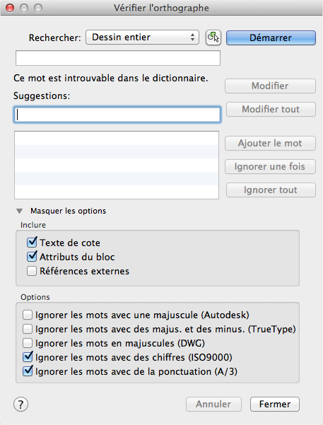 Checks the spelling in single-line text, multiline text, multileader text, text within block attributes, text within xrefs, and text added to dimensions.