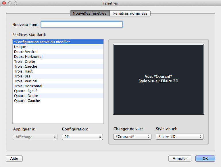 Indique une configuration 2D ou 3D. Si vous sélectionnez l'option 2D, le nouveau fenêtrage est initialement créé avec la vue courante dans toutes les fenêtres. Si vous sélectionnez l'option 3D, un ensemble de vues 3D orthogonales standard est appliqué aux fenêtres de la configuration.