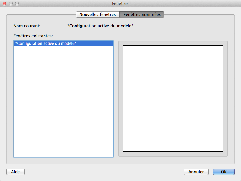 Affiche un aperçu de la configuration de fenêtres que vous sélectionnez et des vues par défaut affectées à chaque fenêtre de la configuration.