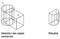 La commande INTERSECT permet de créer un objet composé en conservant uniquement le volume ou la zone en commun de deux ou plusieurs objets qui se chevauchent. INTERSECT retire les portions qui ne se chevauchent pas et crée un objet composé à partir de ce qui reste.