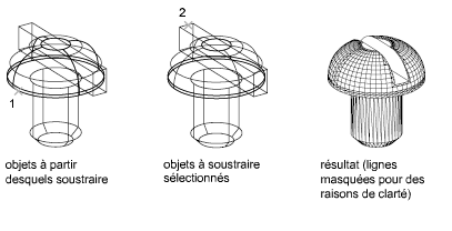La commande SOUSTRACTION permet de supprimer le volume ou la zone en commun d'un jeu d'objets à l'autre. Par exemple, vous pouvez utiliser SOUSTRACTION pour créer des perforations dans une pièce mécanique en soustrayant des cylindres à l'objet.