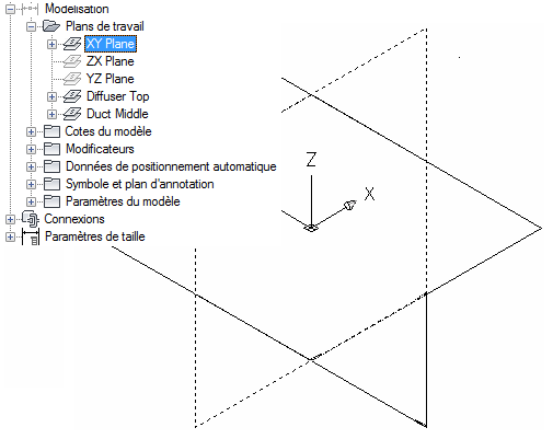Cette procédure permet d'ajouter des plans de travail pour créer la géométrie, les trajectoires et les contraintes d'un modèle. Pour plus de clarté, ne travaillez qu'avec un seul plan dans la mesure où vous n'utilisez pas de plans de travail de décalage et de référence. Les instructions suivantes se rapportent au navigateur de composants. Le navigateur de composants se trouve sous le ruban à la gauche de la zone de dessin.