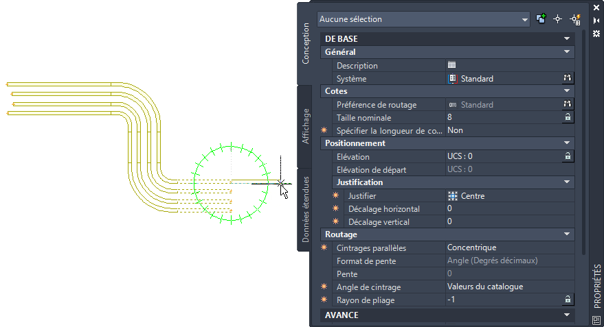 La palette des propriétés fournit deux options de configuration des cintrages parallèles : rayon concentrique ou fixe. Ces options vous permettent de spécifier le type de rayon de courbure en vue d'une utilisation dans une conduite de tube IRO parallèle.