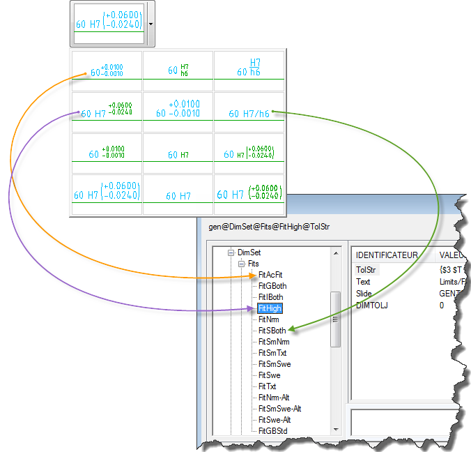 Les identificateurs pour les entrées sous "Fits" et sous "Tols" sont les mêmes, indépendamment du fait que l'entrée concerne un ajustement ou une tolérance.