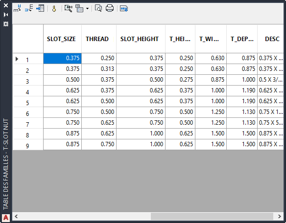 La table des familles est une base de données contenant les valeurs valides pour les paramètres qui définissent chacun des membres de la famille. Chaque ligne décrit un membre unique de la famille de pièces ou d'objets.