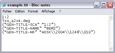 Au lieu de sélectionner manuellement les cadres de dessin, les attributs d'échelle et de cartouche en exécutant la commande AMTITLE, les fichiers *.tit vous permettent de prédéfinir ces paramètres et de les sélectionner automatiquement.