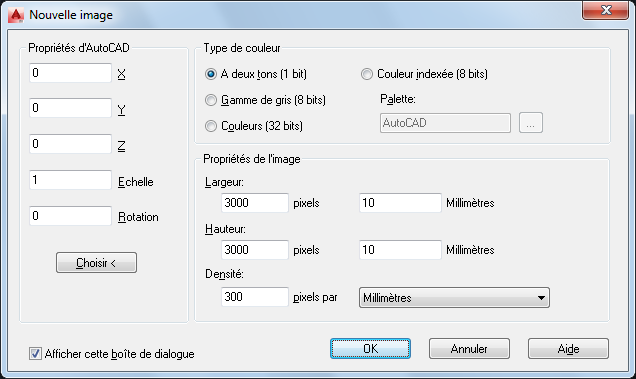 Vous devez ensuite enregistrer l'image afin d'établir un lien entre le dessin et son fichier. Pour définir les propriétés de plusieurs nouvelles images, utilisez l'onglet Nouvelle image de la boîte de dialogue Options de AutoCAD Raster Design.