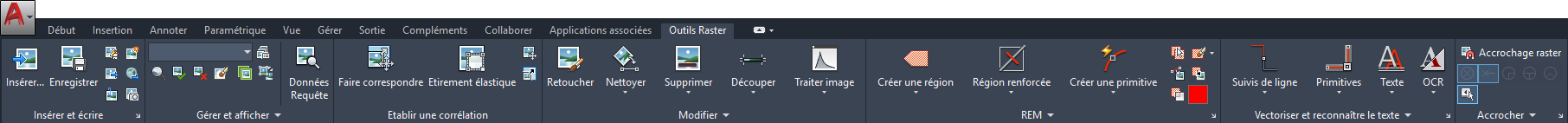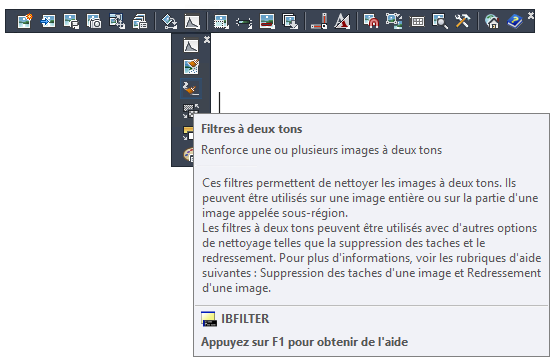 Barre d'outils AutoCAD Raster Design Toolset avec affichage d'un sous-menu ouvert et d'une info-bulle