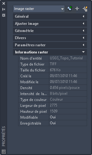 Cet exemple montre l'aspect de la fenêtre Propriétés lorsqu'une image est sélectionnée. Raster Image s'affiche en haut de la fenêtre et les données de l'image apparaissent dans la section Informations, à la fin de la liste des propriétés.