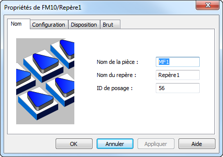 Vous pouvez modifier l'espacement, le décalage, l'imbrication et ainsi de suite dans la boite de dialogue de propriétés. Vous pouvez aussi changer le nom du repère et l'ID de posage directement dans l'onglet Nom.