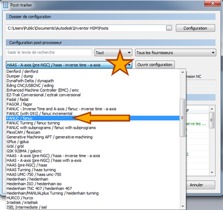 La boîte de dialogue Post-traiter vous permet de contrôler un certain nombre de paramètres. La tâche la plus importante consiste à sélectionner le post-processeur approprié pour la machine. Développez la liste déroulante située sous la section Configuration post-processeur de la boîte de dialogue, puis faites-la défiler jusqu'au post-processeur générique Fanuc. Inventor HSM propose un large choix de post-processeurs pour un grand nombre de contrôles CNC.