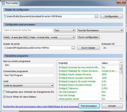 Si un post-processeur ne semble pas convenir à votre machine, vérifiez que vous n'avez pas activé ou désactivé un paramètre susceptible d'affecter le résultat. Examinez les commandes disponibles afin d'ajouter ou de désactiver des fonctions. Tous les post-processeurs ne proposent pas les mêmes options.