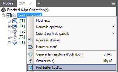 Vous pouvez post-traiter une seule trajectoire d'outil ou plusieurs à la fois. Pour sélectionner toutes les trajectoires d'outil, cliquez sur Configuration dans le navigateur. Une fois cette sélection effectuée, vous pouvez cliquer avec le bouton droit de la souris sur les opérations et choisir Post-traiter. Vous pouvez également accéder à ce paramètre en développant le groupe de fonctions Actions.