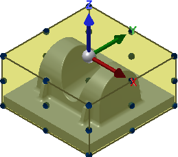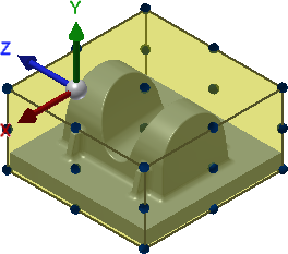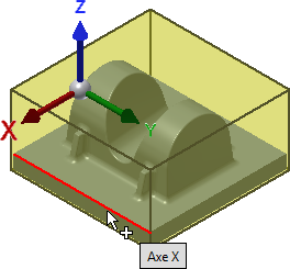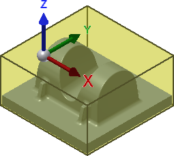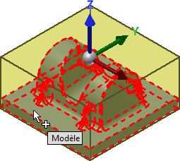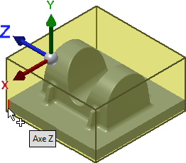 Dans la fenêtre graphique, la matière du brut est définie automatiquement autour du cube capable de la pièce. L'orientation du modèle est indiquée par le WCS en haut de la pièce. L'orientation des axes XYZ et l'origine du WCS doivent être redéfinies.