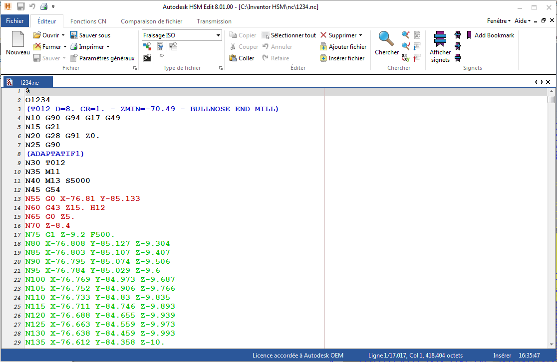 Après le post-traitement, le programme NC obtenu est automatiquement ouvert dans HSM Edit.