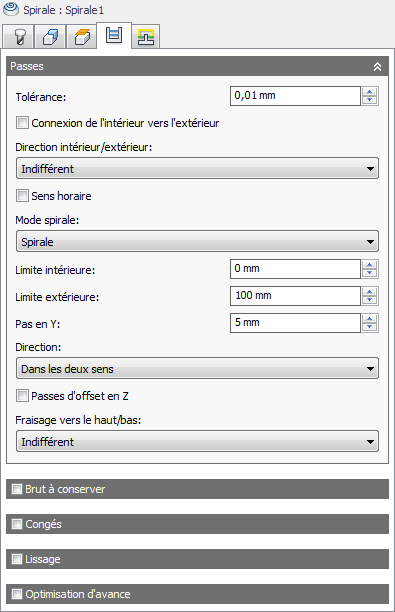 Dans le cadre des opérations de finition, la valeur par défaut est égale à 0 mm/0 po ; autrement dit, aucune quantité de matière n'est conservée.