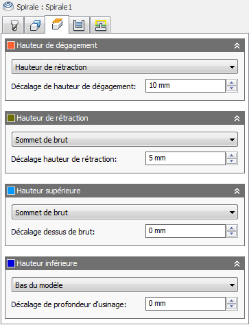 La hauteur de rétraction spécifie la hauteur qu'atteint l'outil avant la passe de coupe suivante. Elle doit être définie sur une valeur supérieure à celle des paramètres Hauteur d'avance et Haut. La hauteur de rétraction s'utilise conjointement avec le décalage ultérieur pour définir la hauteur.