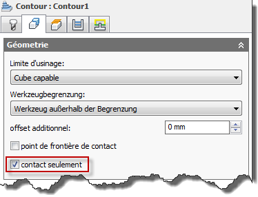 La plupart des stratégies de finition 3D dans Inventor CAM (Contour, Parallèle, etc.) disposent d'un paramètre appelé Contact seulement dans l'onglet Géométrie.