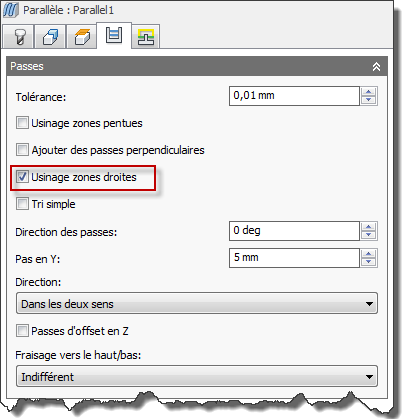 Une opération Parallèle produit généralement des trajectoires d'outil de haute qualité pour les zones peu profondes. Si la pièce contient des zones pentues, une finition de faible qualité est obtenue lors de l'usinage effectué le long des zones pentues, plutôt qu'en travers de ces zones. La stratégie Parallèle fournit un paramètre Usinage zones droites dans l'onglet Passes qui évite l'usinage le long des zones pentues en choisissant automatiquement la meilleure direction pour les passes parallèles.