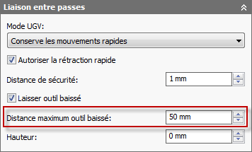 Inventor CAM vous permet de contrôler si vous souhaitez laisser l'outil baissé. Pour cela, il vous suffit de définir le paramètre Distance maximum outil baissé qui permet de réduire le nombre de rétractions. Ce paramètre se trouve dans l'onglet Liaison entre passes.