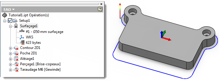 Inventor CAM vous permet de protéger chaque opération contre le risque d'invalidation lors de la modification du modèle. Cette option est utile si vous avez déjà exécuté des opérations sur la machine et que vous souhaitiez procéder à l'usinage de la matière restante à partir de ces opérations tout en intégrant les modifications apportées au modèle.