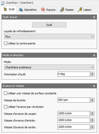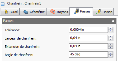 Affichés de gauche à droite : Extension - Largeur du chanfrein - Angle