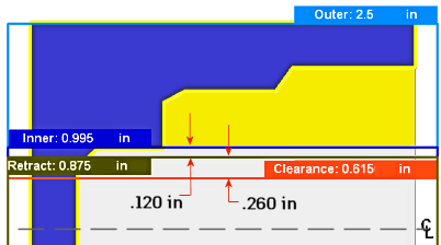 Affiché en bleu foncé, ce paramètre définit la plus petite limite radiale de la zone de coupe. Pour l'usinage extérieur (diamètre extérieur), le rayon intérieur contrôle la profondeur maximale de la zone de coupe. Pour l'usinage intérieur (diamètre intérieur), le rayon intérieur définit la surface intérieure du brut que vous prévoyez d'usiner.