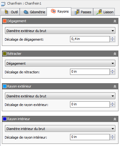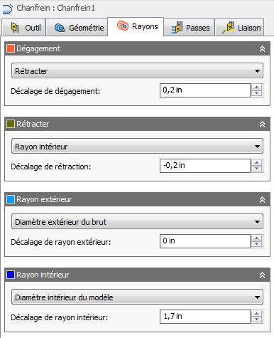 L'onglet Rayons permet de définir une zone de limitation radiale pour l'usinage. La boîte de dialogue change selon que le paramètre Mode de tournage (onglet Outil) est défini sur Chanfreins extérieurs ou Chanfreins intérieurs. Ces paramètres sont codés en couleur afin de faciliter leur identification.