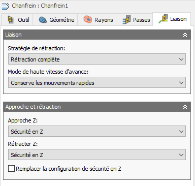 Rétracter Z : Définit la manière dont l'outil se positionne à la fin de la trajectoire d'outil.
