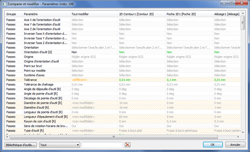 La boîte de dialogue Comparer et éditer donne un aperçu des paramètres dans toutes les opérations sélectionnées. De nombreuses opérations comportant un grand nombre de paramètres, il est possible de filtrer l'affichage de la liste à l'aide des commandes de filtrage situées dans la partie inférieure de la boîte de dialogue.