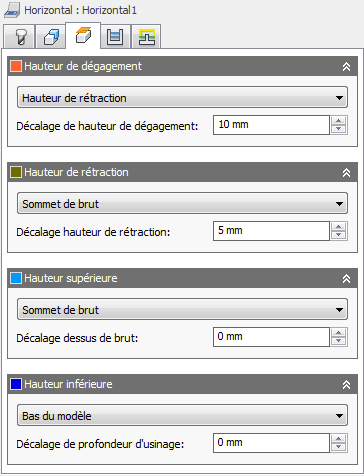 La hauteur de rétraction spécifie la hauteur qu'atteint l'outil avant la passe de coupe suivante. Elle doit être définie sur une valeur supérieure à celle des paramètres Hauteur d'avance et Haut. La hauteur de rétraction s'utilise conjointement avec le décalage ultérieur pour définir la hauteur.