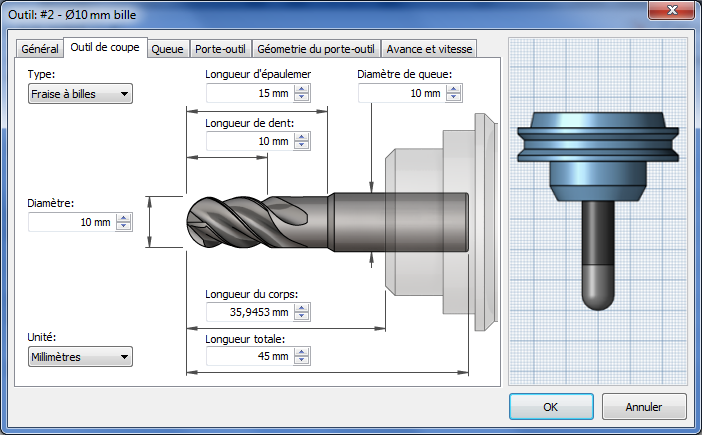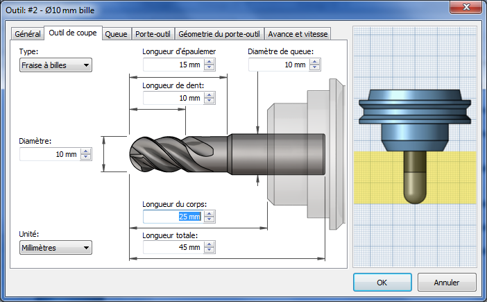 L'avertissement suivant est inscrit dans le journal lors de la génération de la trajectoire d'outil alors que l'option Détection de la longueur d'outil est active et que l'outil est trop court : Avertissement: la longueur de l'outil, initialement définie sur 25 mm, a été remplacée par la valeur 35,9453 mm pour veiller à ce que le porte-outil n'entre pas en contact avec la pièce.