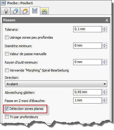 Les stratégies de dégagement 3D (Ebauche 3D adaptative et Ebauche poches), ainsi que la stratégie de finition Contour comportent, dans l'onglet Passes, un paramètre appelé Détection zones planes. Lorsque celui-ci est activé, la stratégie détecte toutes les zones planes et ajuste les dépassements pour garantir le maintien de la surépaisseur axiale sur ces zones planes.
