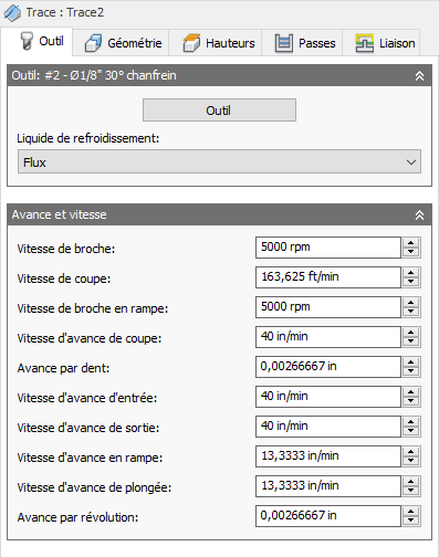 Paramètres de coupe pour les broches et l'avance.