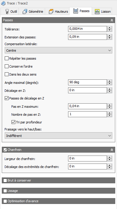 Dans le cadre des opérations de finition, la valeur par défaut est égale à 0 mm/0 po ; autrement dit, aucune quantité de matière n'est conservée.